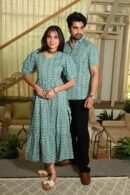 A refreshing green cotton outfit with a modern arrow-inspired print. The woman?s puff-sleeve dress and the man?s collared shirt create a stylish, casual-yet-classy matching look for outings, vacations, and everyday wear.